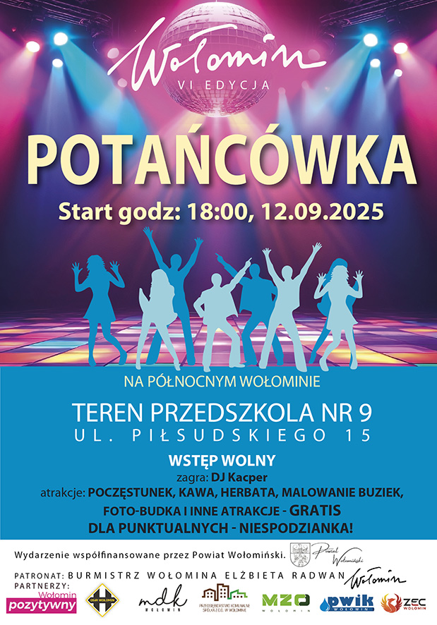 Przed nami VI edycja Potańcówki w Wołominie! W piątek 12 września teren Przedszkola nr 9 przy ul. Piłsudskiego 15 zamieni się w wielki parkiet do tańca!