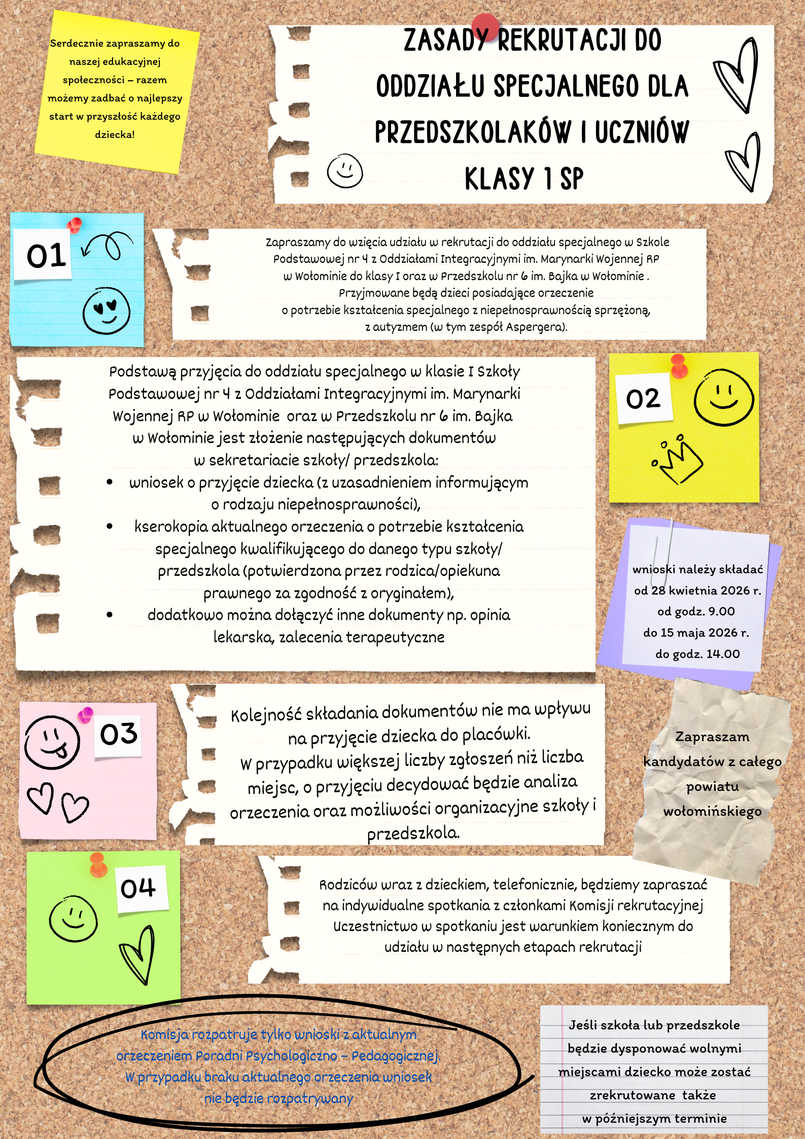 1. Złożenie wniosku o przyjęcie wraz z kopią aktualnego orzeczenia o potrzebie kształcenia specjalnego od 28 kwietnia 2026 r. od godz. 9.00
